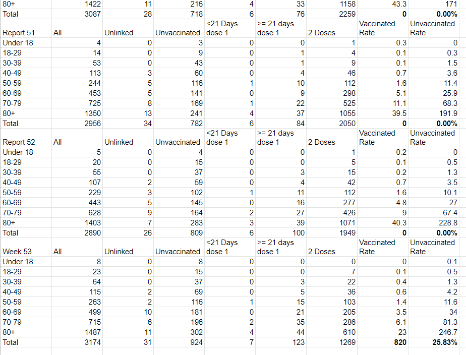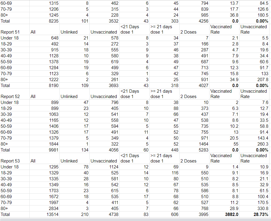 I am going to assume there is an unintentional error here as this data has been extremely consistent. I suspect that perhaps they internally have a boosted column or two now, but they didn’t get put into the report (or we did get the boosted column but it’s labelled the 2 Dose column, that actually seems pretty consistent with what I’m seeing.)