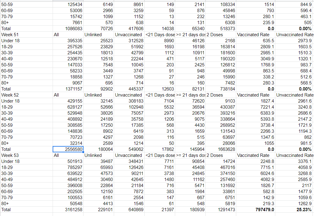 Yes, there are 797,479 cases missing. So the obvious question is WHERE are they missing? Well based on how this data is presented, the only place they CAN be missing is from the 2 Dose column. Why do I say that? Because these are sliding windows of data, 4 weeks at a time. It is literally impossible for a particular value (say the number of cases 70-79 years old, fully vaccinated) to go from 15990→63697→6751 over 3 weeks. The change from 15990 to 63697 only requires a very large influx of cases which Omicron provides. The problem is that we know that all four weeks added together the week before was 15990. So Weeks 47, 48, 49, and 50 which make up report 51 add up to 15990 cases. Week 52 sees a total of 63697 after adding week 51 and removing week 47. Let’s imagine the absolute worst case for week 53 which is that week 48 had all 15990 cases. We know this isn’t true, but it’s the worst case. That would mean that week 51 had 47,707 cases in it. Now in the new report week 48 rolls off and week 52 rolls on. We have a floor of 47,707 cases this week. There cannot be fewer even if week 52 has zero cases as well.